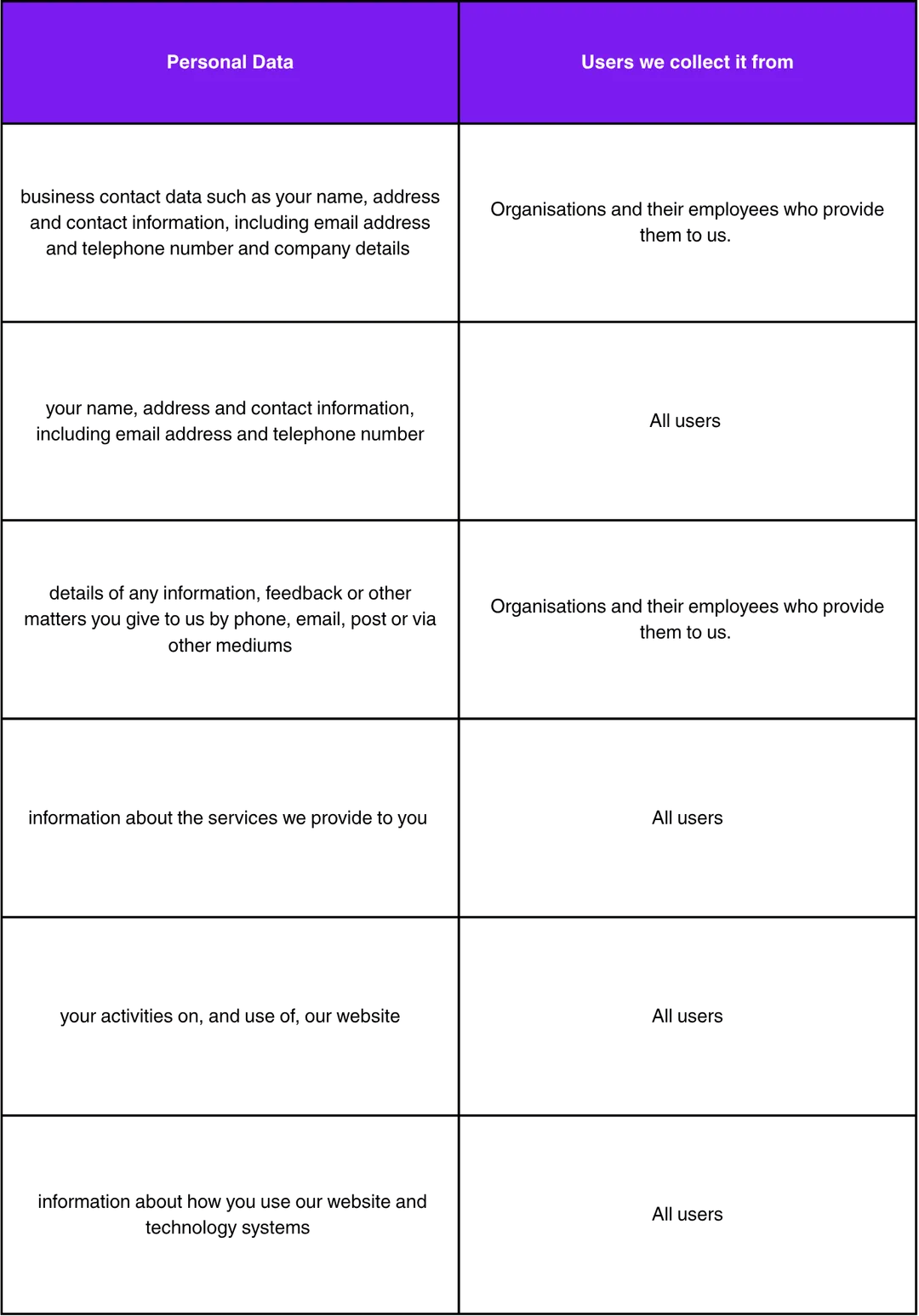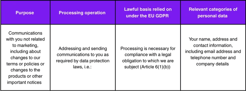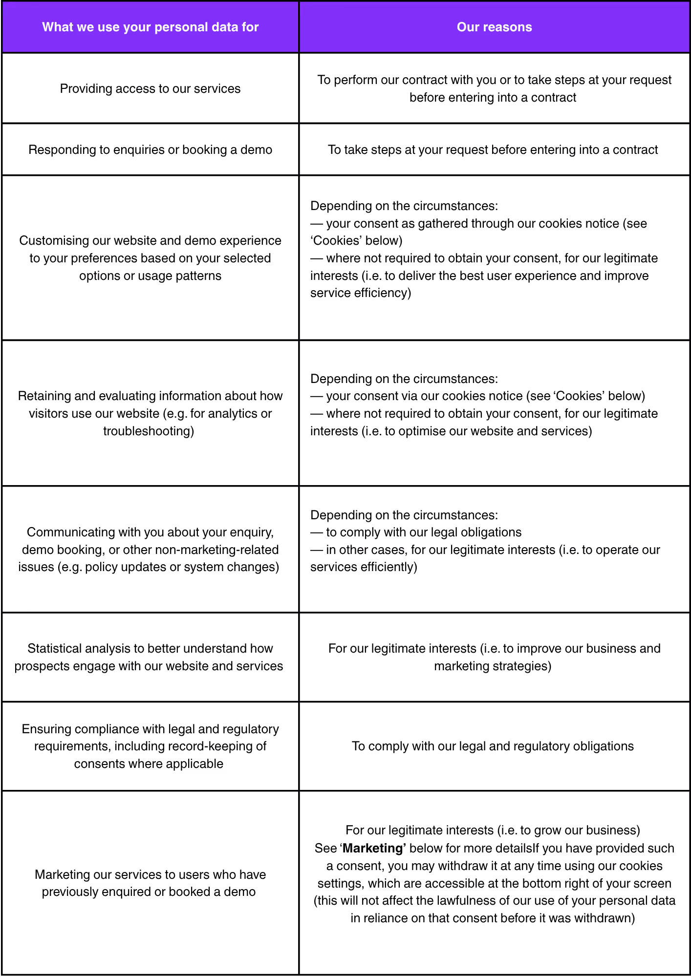 More details about how we use your personal data and why are set out in the table below: